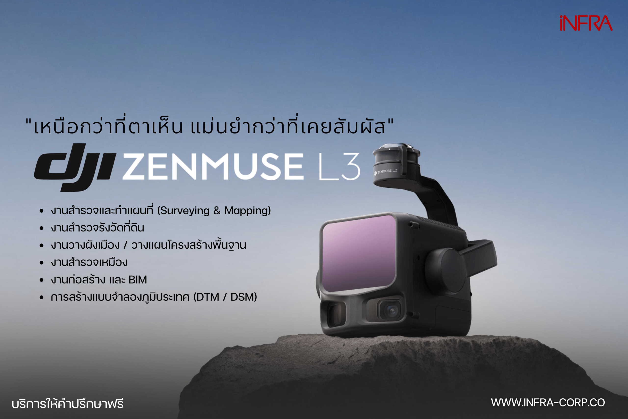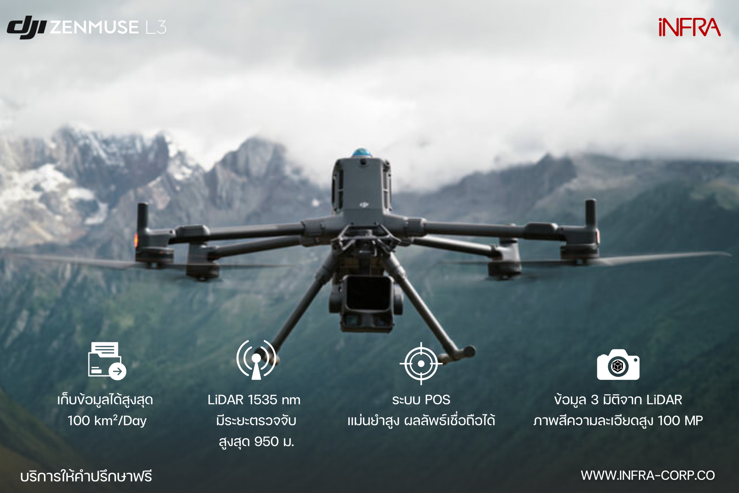 DJI Zenmuse L3 คือโซลูชัน LiDAR รุ่นใหม่จาก DJI Enterprise ที่ผสานพลังของเลเซอร์สแกนความละเอียดสูงเข้ากับกล้อง RGB ระดับ 100MP และระบบประมวลผลขั้นสูง ช่วยให้การทำ 3D Mapping, Digital Elevation Model (DEM), Topographic Survey และ Infrastructure Inspection มีความแม่นยำ รวดเร็ว และครอบคลุมมากกว่าที่เคย